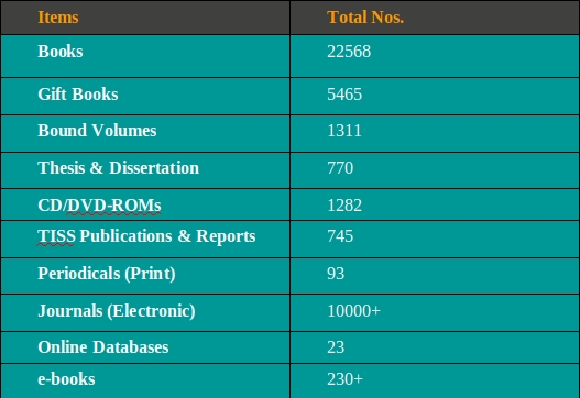 metamorphosis, from print-only format; it has shifted to print-and-online and to online-only formats. Presently, the library provides access to over 10000 plus online journals. However, it is no longer possible for a research library to build its collection in vacuum, collaboration among institutions is essential. The library has established links particularly with TISS Mumbai, TISS Hyderabad & TISS Guwahati Libraries to provide wide access to prominent and classical resources of these libraries. The library collection comprising of books, bound volumes, journals (Print only, print +online) theses, reports, and other reading material as on 1 December 2022 stood as follows: